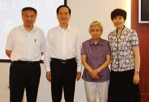 全国人大常委会副委员长、九三学社中央主席韩启德(左二),九三学社中央副主席邵鸿(左一),王选院士夫人陈堃銶教授(右二)与《王选传》作者丛中笑(右一)在新书首发式上合影留念