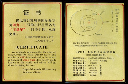 2008年1月31日,经国际小行星中心和国际小行星命名委员会批准,国际编号为4913号小行星,正式命名为“王选星”。